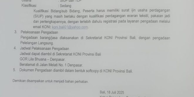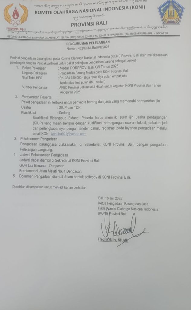 Pengumuman Pelelangan Mendali PORPROV Bali XVI Tahun 2025 Koni Bali 18 Juli 2025 Seputar Koni Bali Komentar Dinonaktifkan pada Pengumuman Pelelangan Mendali PORPROV Bali XVI Tahun 2025 31 Views Share Facebook Twitter